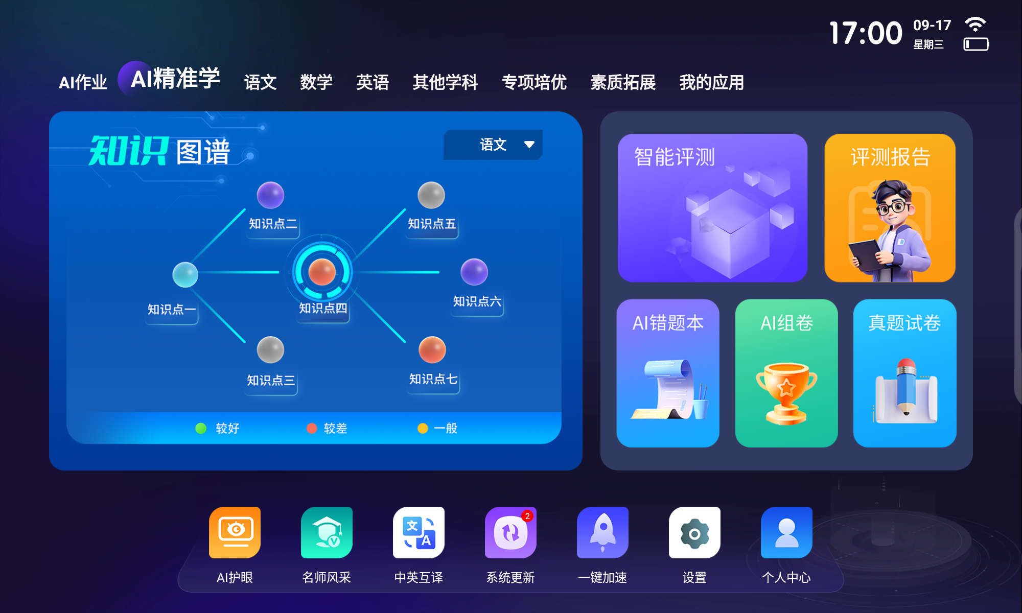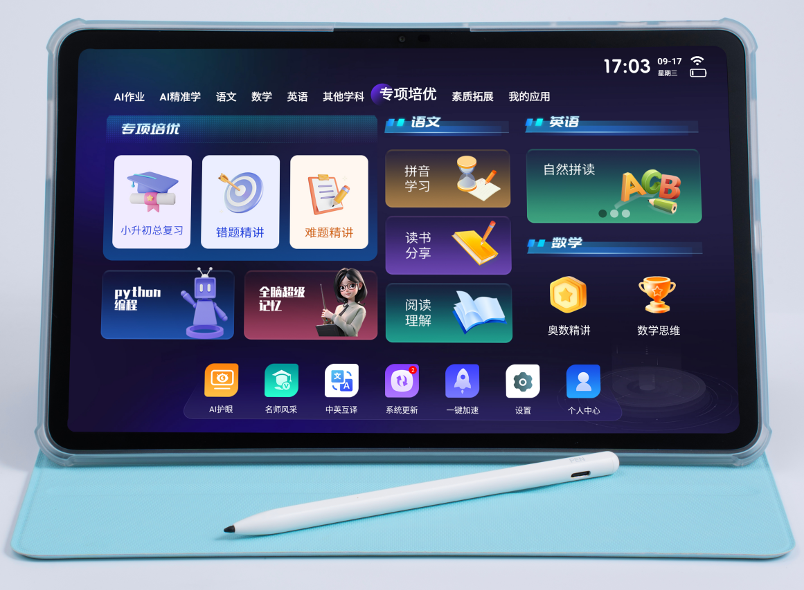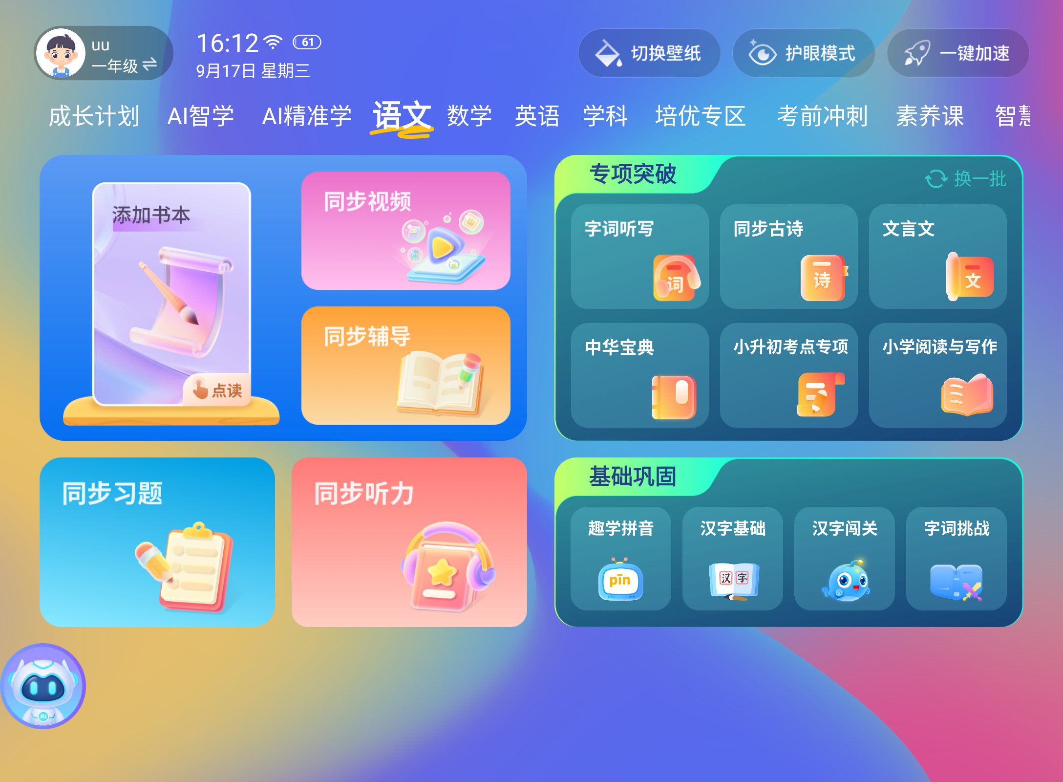 最让我惊喜的是它分龄分段的贴心设计。老大上初中,老二刚上小学,一台机器就能满足俩娃需求。系统会根据孩子的学段自动推送学习任务,老二学拼音时有 “拼音乐园”“汉字闯关”,像玩游戏一样就把基础打牢了;老大复习数学时,AI 能通过 19 张学科图谱、3 万 + 单元图谱精准找出薄弱点,比如之前总搞混的几何图形知识点,系统直接推送精讲视频、经典例题和学霸笔记,还能生成 “阶段测”,从单元到期中期末一步步巩固,再也不用我对着课本瞎琢磨怎么帮他补。