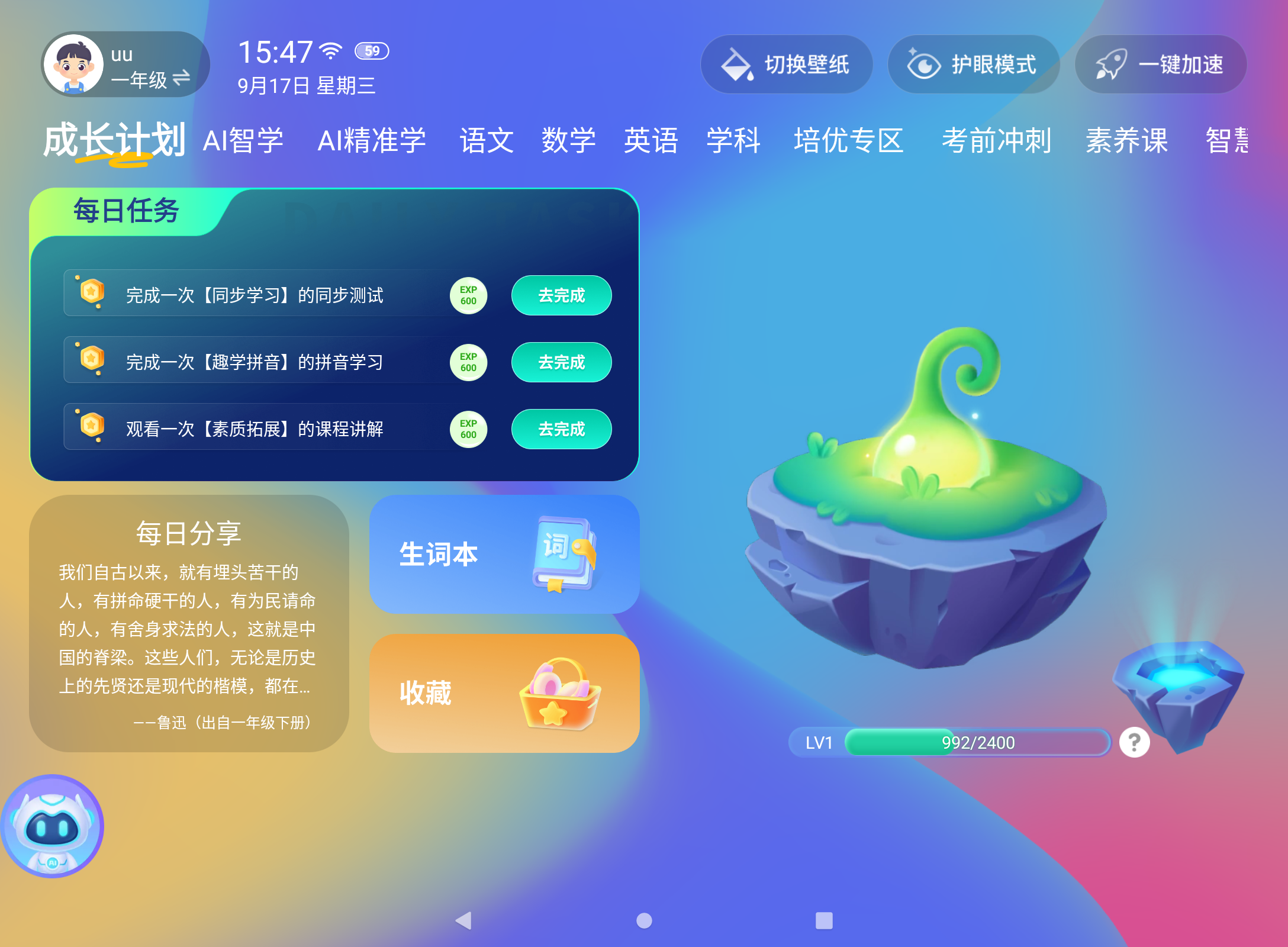 春苗护航AI智能学习机搭载的孩子专属成长系统,彻底解决了传统学习中 “动力不足” 的痛点。系统会根据幼儿园、小学、初中、高中等不同学段,每日推送适配的学习任务 —— 低年级孩子可能收到 “拼音闯关练习”,高中生则会获得 “数学函数专题训练”。家长可通过完成度给予星星奖励,对应的 “成长树” 会同步长出新叶、开花,这种可视化的进步反馈,让孩子在成就感中主动爱上学习。