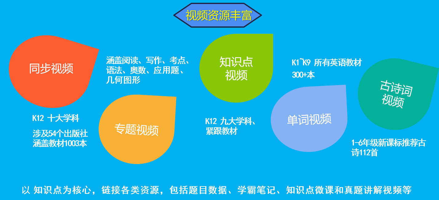 - 同步视频:覆盖 K12 十大学科、54 个出版社、1003 本教材,真人老师生动讲解;