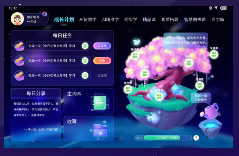 每个孩子都是独一无二的,这款系统为孩子量身定制了专属成长路径:每天根据孩子的学习阶段推送匹配任务,完成后家长可给予个性化激励,同步触发 “成长树” 升级 —— 从嫩芽到枝繁叶茂,孩子能直观看到自己的进步,学习成就感油然而生!