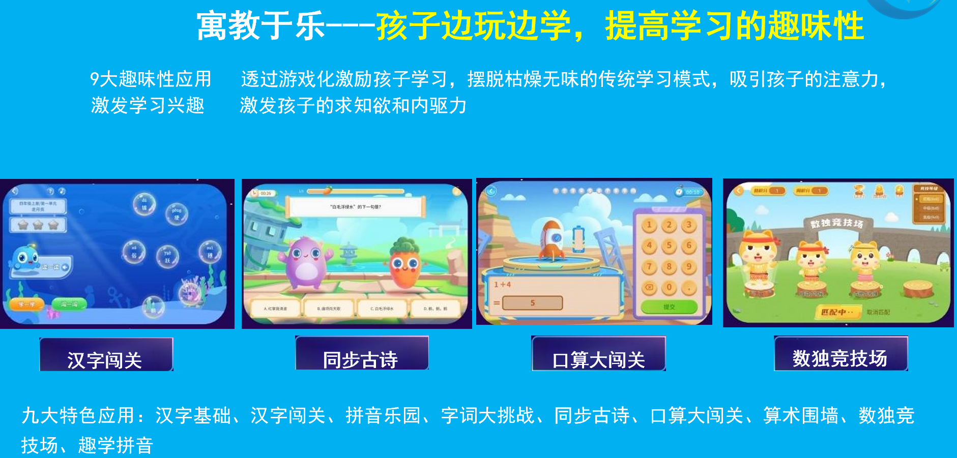 系统摒弃 “枯燥刷题” 模式,设计了汉字闯关、拼音乐园、口算大挑战、数独竞技场等九大应用,将知识融入游戏:比如 “汉字闯关” 通过偏旁部首组合解锁关卡,“趣学拼音” 用动画演示发音口型,孩子在玩乐中自然掌握知识,学习兴趣大幅提升。