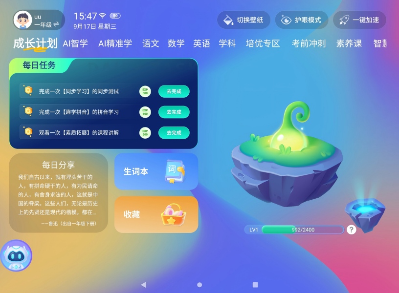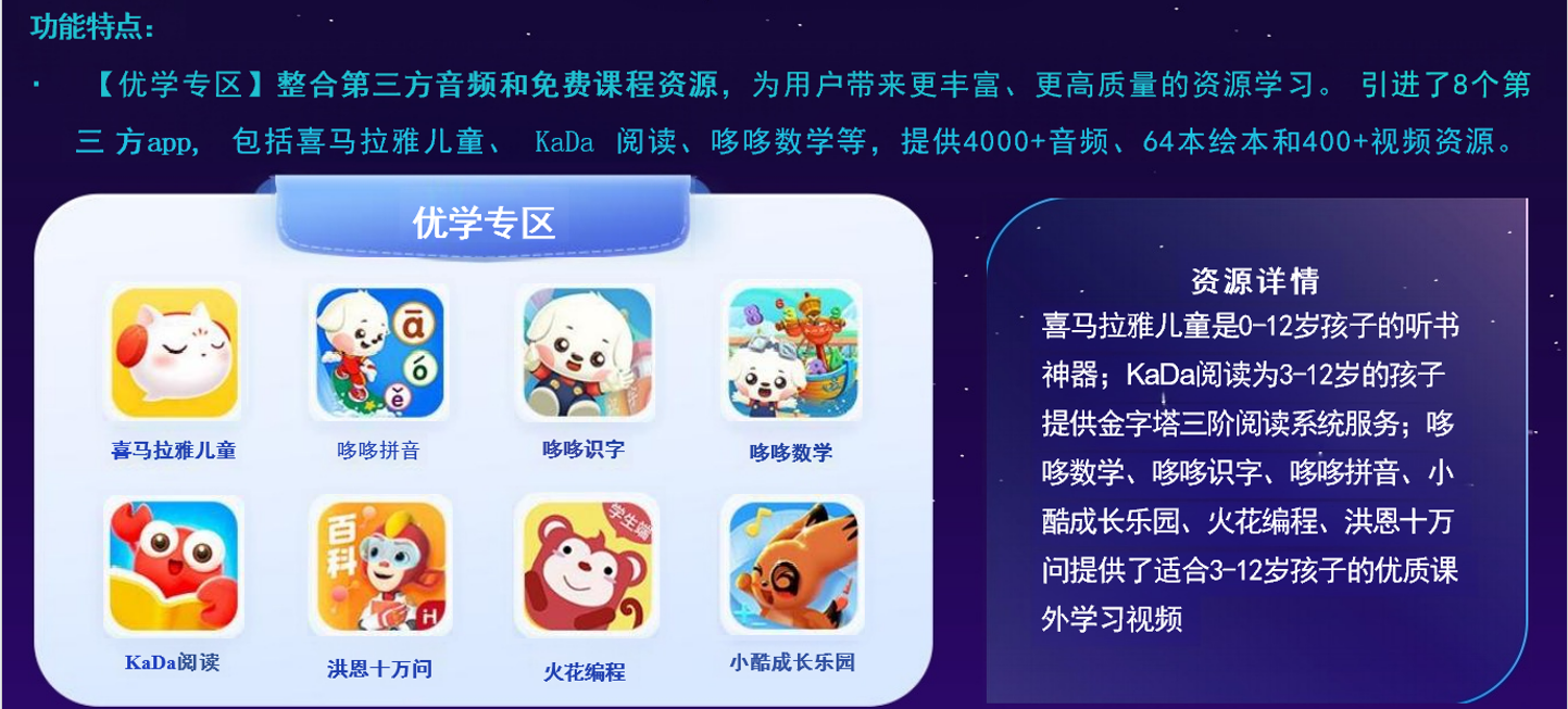 - 学有余力:提供 “优学专区” 资源 —— 整合喜马拉雅儿童、KaDa 阅读等 8 个第三方 APP,包含 4000 + 音频、64 本绘本、400 + 视频,实现培优拓展。